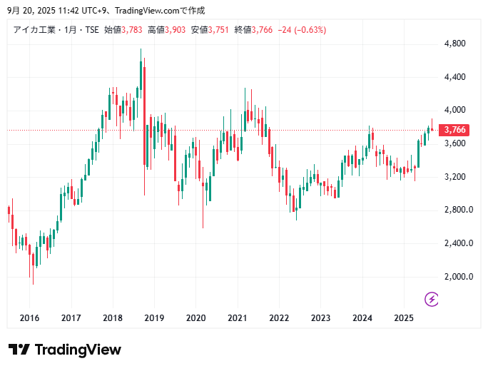 アイカ工業10年間の株価チャートの動きです。