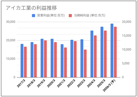 アイカ工業過去10年分の営業利益と当期純利益をグラフにしてみました。