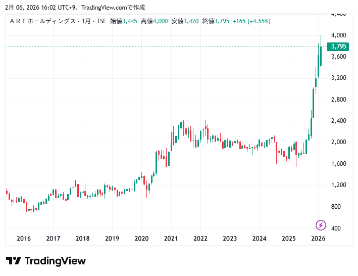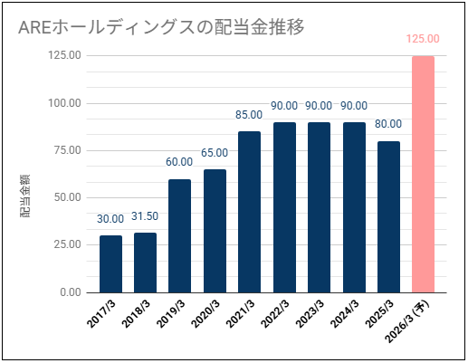 AREホールディングスの年間配当金は125円予定、株価は3,795円なので予想年間配当利回りは約3.3%です。