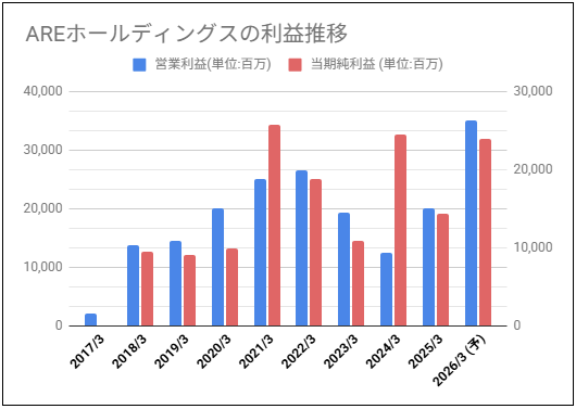 AREホールディングス過去10年の営業利益と当期純利益をグラフにしてみました。