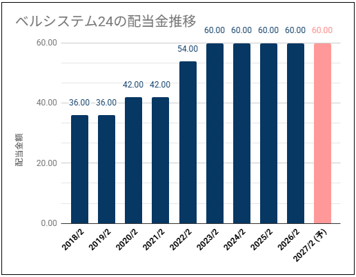 ベルシステム24の年間配当金は60円予定、株価は1,156円なので予想年間配当利回りは約5.2%です。