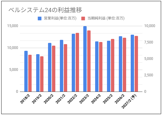 過去10年分のベルシステム24の営業利益と純利益のグラフを確認していきます。