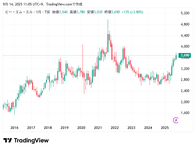 ビー・エム・エルの10年間の株価チャートの動きです。