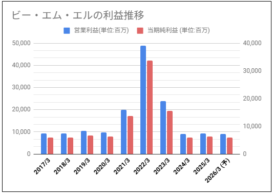 過去10年分のビー・エム・エルの営業利益と純利益のグラフを確認していきます。