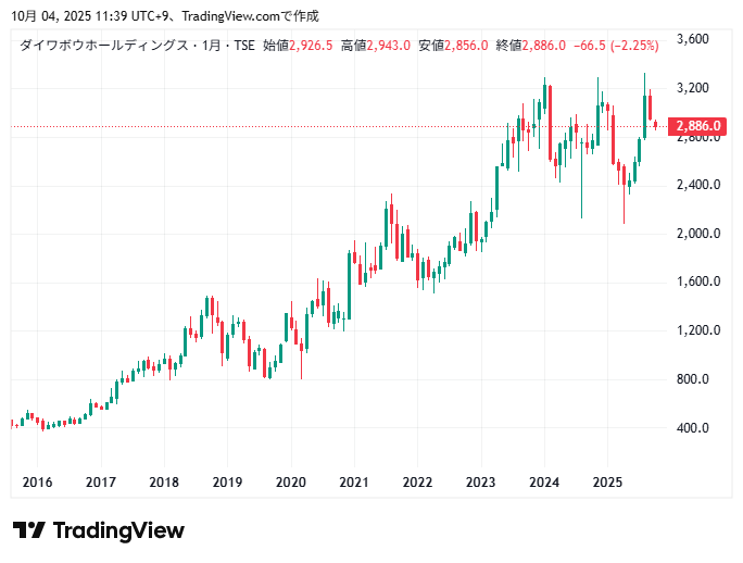 ダイワボウの10年間の株価チャートの動きを見ていきます。