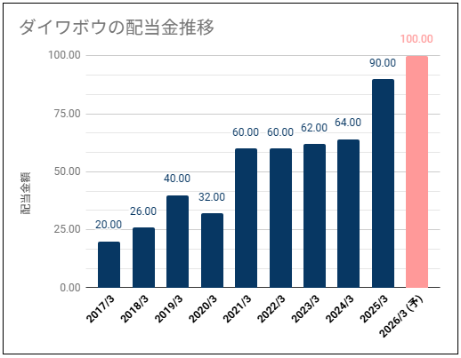 ダイワボウの年間配当金は100円予定、株価2,886円なので予想年間配当利回りは約3.5%です。