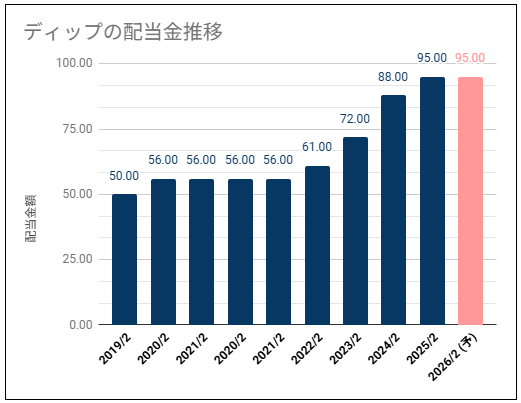 ディップは年2回 (中間・期末) の配当を実施してます。2月末が決算ですね
