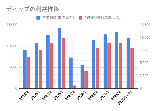 ディップ過去10年分の営業利益と当期純利益をグラフにしてみました。