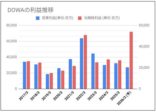 DOWAホールディングス過去10年の営業利益と当期純利益をグラフにしてみました。