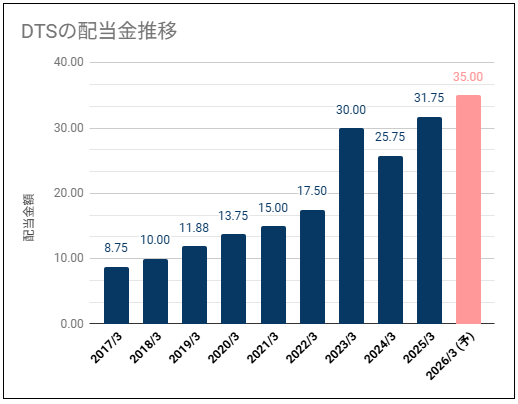 DTS(9682)の配当金診断。安定増配の配当推移で高めの利回りだが配当性向も高め