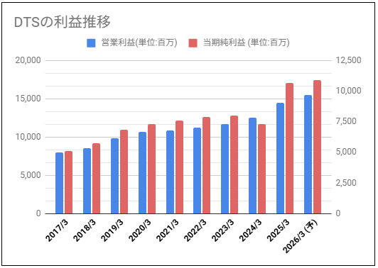 DTS過去10年分の営業利益と当期純利益をグラフにしてみました。