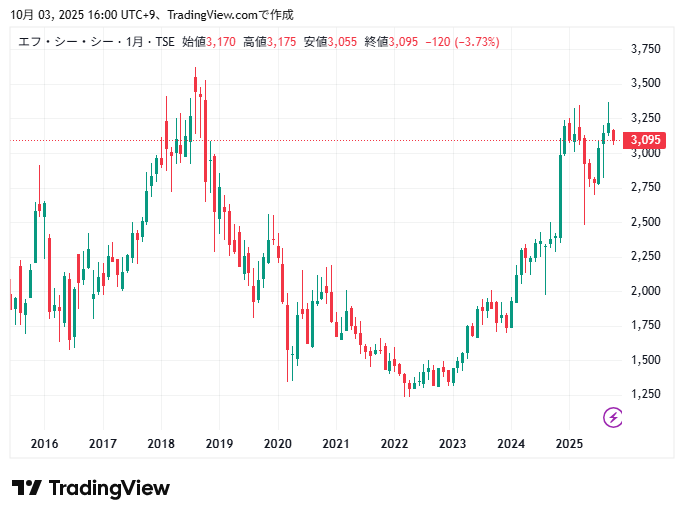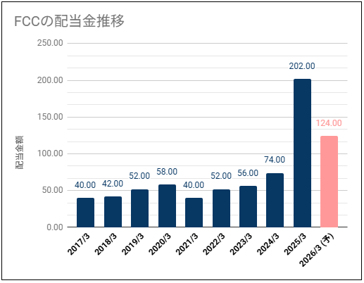FCCの年間配当金は124円予定、株価は3,095円なので年間配当利回りは約4.0%です。