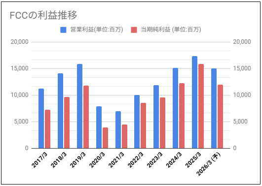 過去10年分のFCCの営業利益と純利益のグラフを確認していきます。