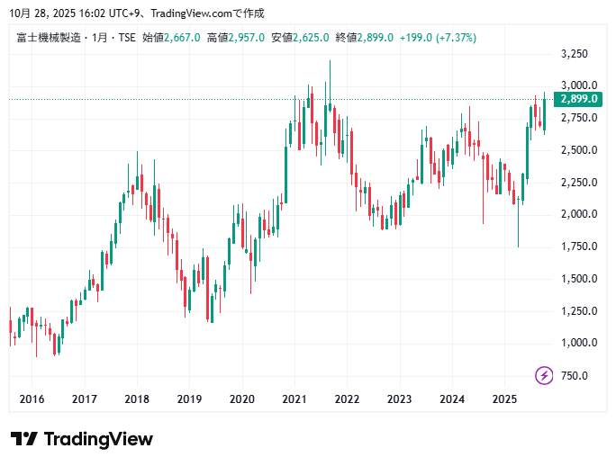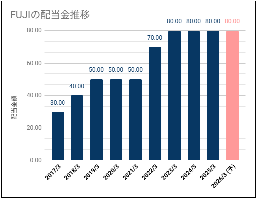 FUJIの年間配当金は80円予定、株価は2,899円なので年間配当利回りは約2.8%です。