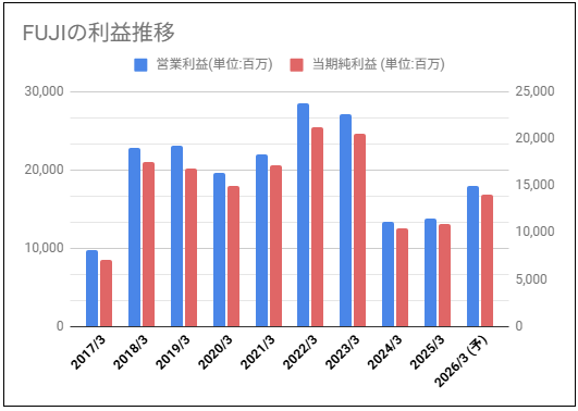 FUJI過去10年分の営業利益と純利益のグラフを確認していきます。