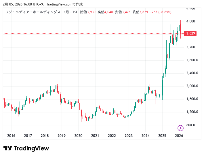 フジ・メディア・ホールディングスの10年間の株価チャートの動きです。