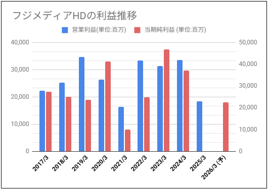 2021年3月期は不動産・テレビ広告収入などが厳しく、かなり利益が減っていますね。その後は回復していましたが、2025年3月期の純利益は赤字ですね。今後の利益がどうなるか確認ですね。