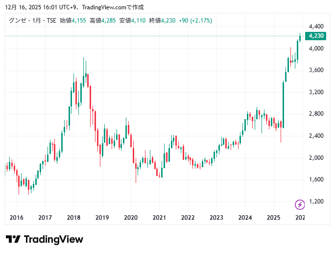 グンゼの10年間の株価チャートの動きを見ていきます。
