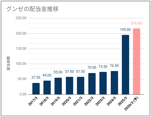 グンゼの年間配当金は216円予定。株価は4,230円なので年間配当利回りは約5.1%です。