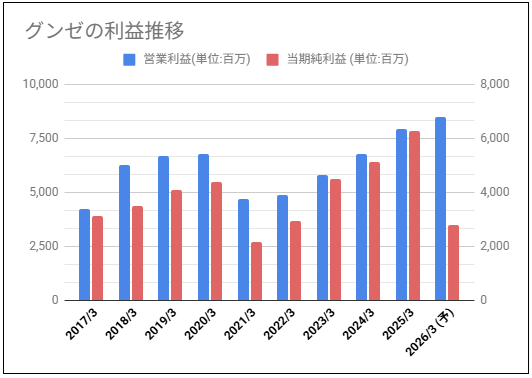グンゼの過去10年分の営業利益と当期純利益をグラフにしてみました。