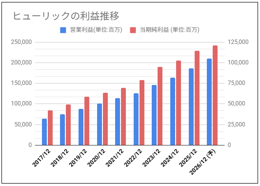 過去10年分のヒューリックの営業利益と純利益のグラフを確認していきます。