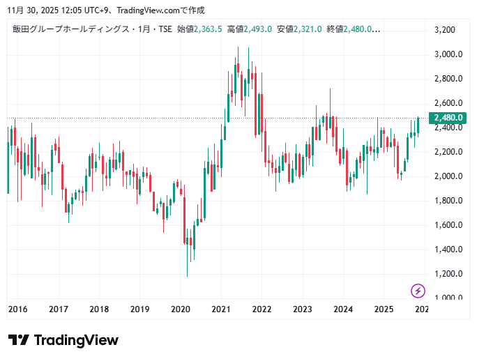 飯田グループホールディングスの10年間の株価チャートの動きです。