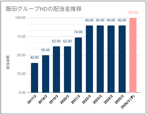 配当金の推移は悪くはない感じですね。ここ数年は90円で据え置き推移ですが、2026年3月期は増配予定ですね。