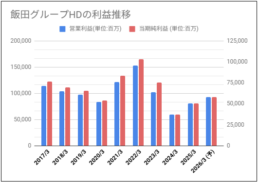 過去10年分の飯田グループホールディングスの営業利益と純利益のグラフを確認していきます。