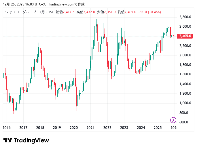 ジャフコグループの年間配当金は133円、株価は2,405円なので予想年間配当利回りは約5.5%です。