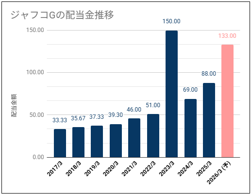 ジャフコグループの配当金がどのように推移しているのか10年分をグラフにして見ました。