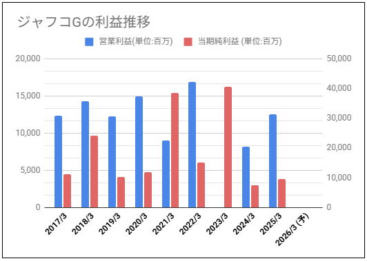 ジャフコグループ過去10年分の営業利益と純利益のグラフを確認していきます。