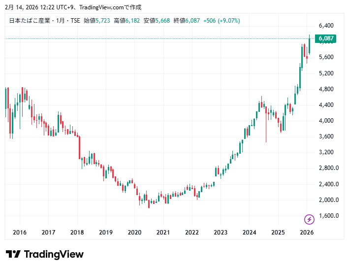 JTの年間配当金は242円予定、株価は6,087円なので予想年間配当利回りは約4.0%です。