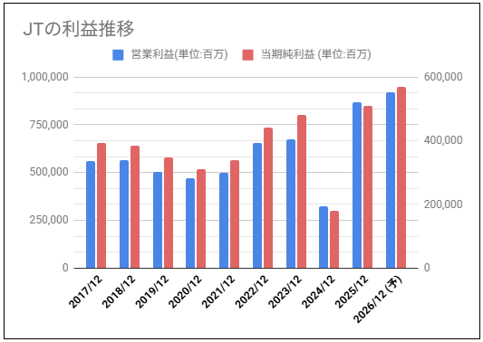 過去10年分のJTの営業利益と純利益のグラフを確認していきます。