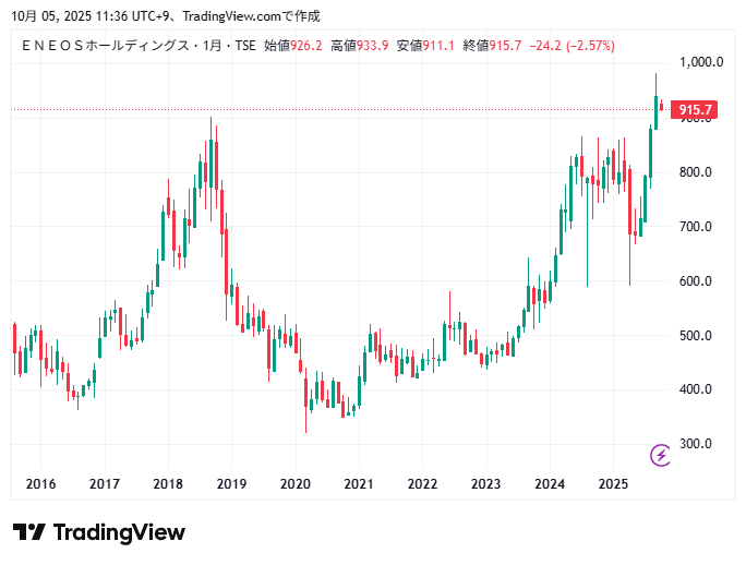 ENEOSの年間配当金は30円予定、株価は915.7円なので予想年間配当利回りは約3.3%です。