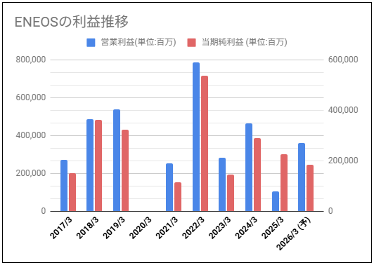 ENEOSの過去10年分の営業利益と純利益のグラフを確認していきます。
