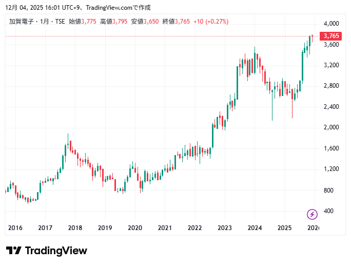 加賀電子10年間の株価チャートの動きです。