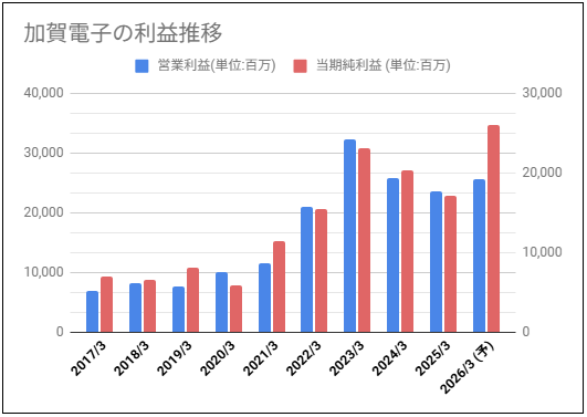 加賀電子過去10年の営業利益と当期純利益をグラフにしてみました。