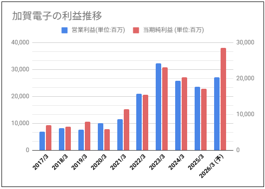 加賀電子過去10年の営業利益と当期純利益をグラフにしてみました。