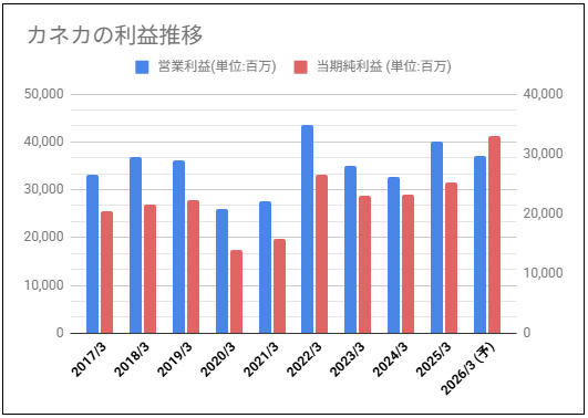 カネカの利益と株価チャートの動きを確認