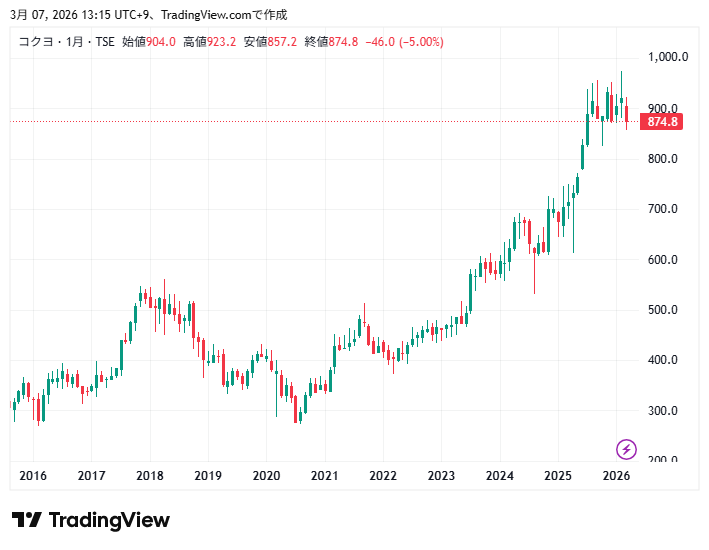 コクヨの10年間の株価チャートの動きです。