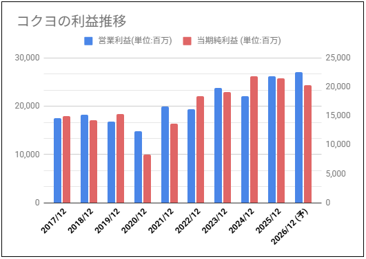 過去10年分のコクヨの営業利益と純利益のグラフを確認していきます。
