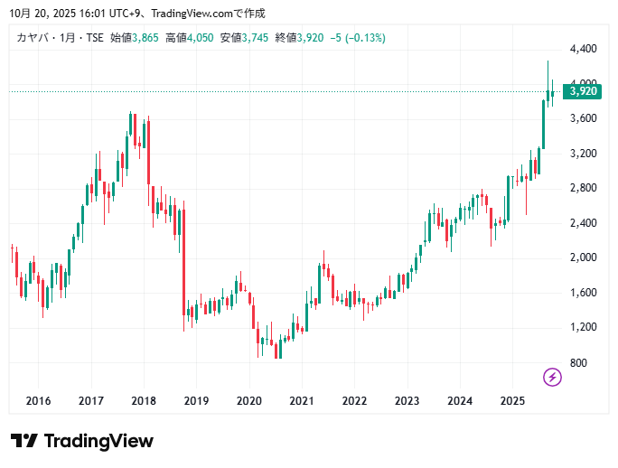 カヤバの年間配当金は120円予定、株価は3,920円なので予想年間配当利回りは約3.1%です。