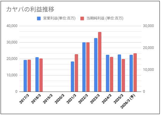 過去10年分のカヤバの営業利益と純利益のグラフを確認していきます。