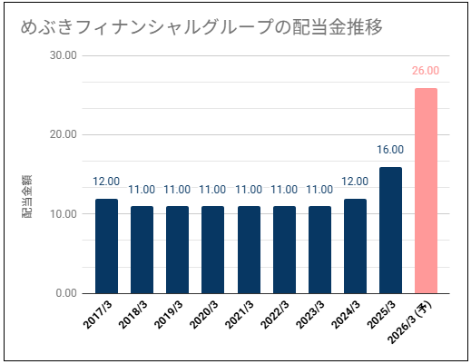 過去のめぶきフィナンシャルグループの配当金推移を確認していきます。