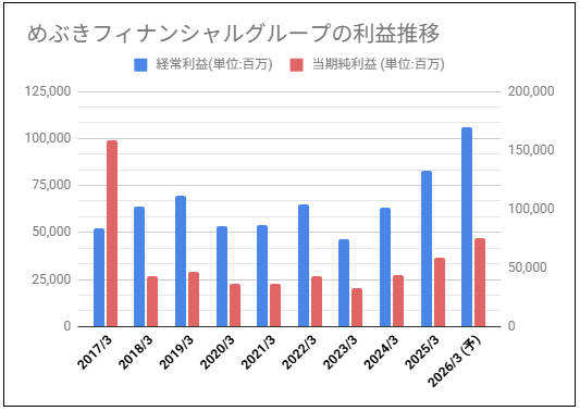 2017年3月期の純利益は統合に伴って発生した特別利益が大きくて突出していますね。利益はバラツキ感がありましたが、2025年3月期は増えて、2026年3月期はさらに増える予想ですね。
