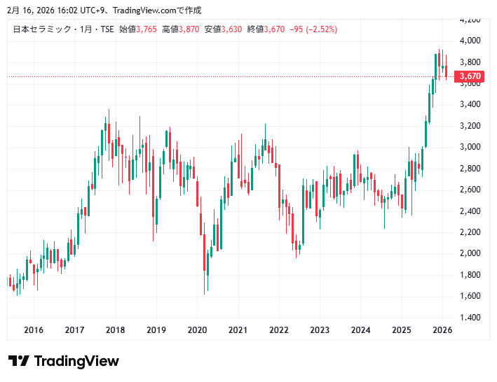 日本セラミックの年間配当金は165円予定、株価は3,670円なので予想年間配当利回りは約4.5%です。