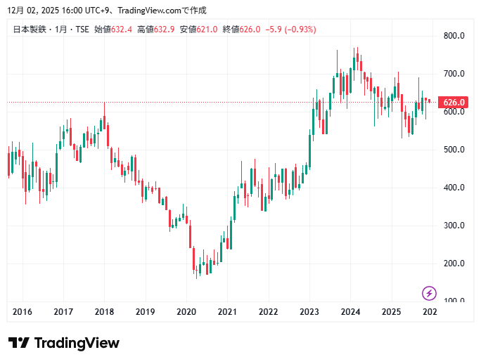 日本製鉄の年間配当金は24円予定、株価は626円なので年間配当利回りは約3.8%です。