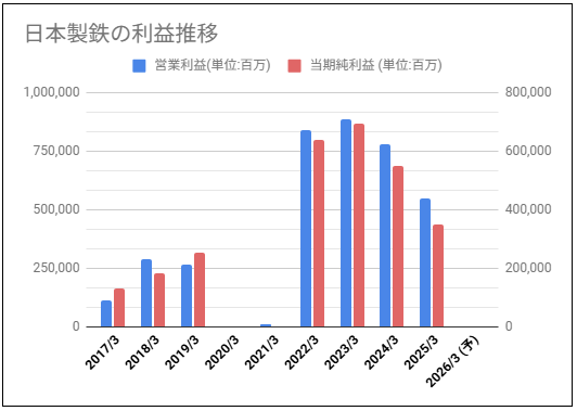 日本製鉄過去10年の営業利益と当期純利益をグラフにしてみました。