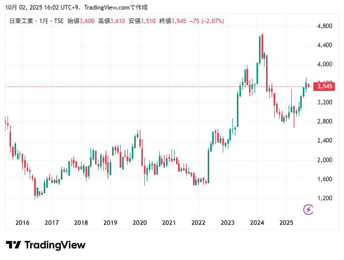 日東工業の年間配当金は124円予定、株価は3,545円なので予想年間配当利回りは約3.5%です。