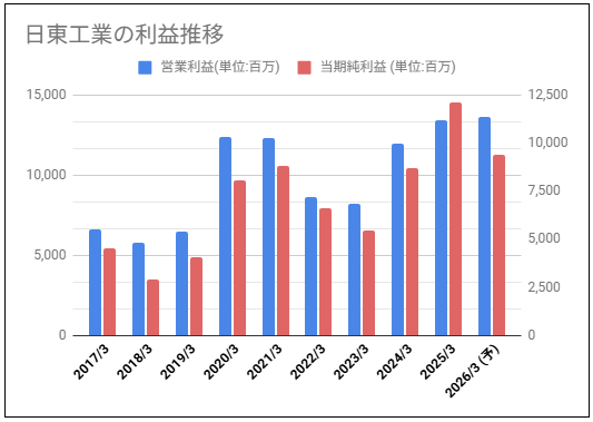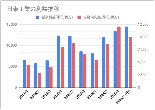 日東工業過去10年分の営業利益と純利益のグラフを確認していきます。